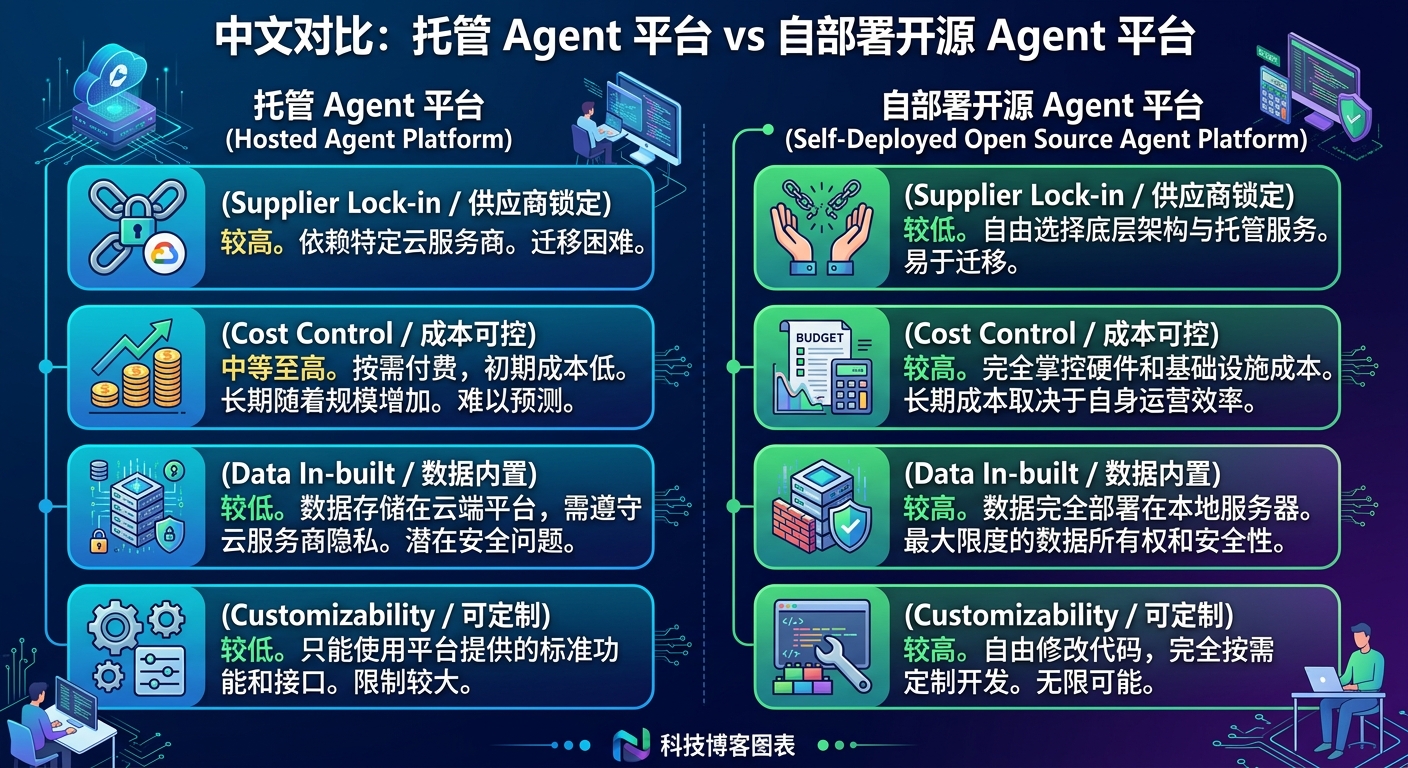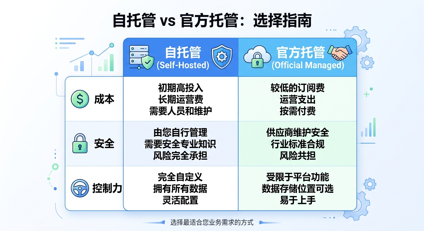 官方托管方案的优点当然很明显:开箱即用、体验统一、文档完善。但一旦公司真的把重要流程交给它,焦虑也会同步出现:成本怎么控?日志看不看得到?数据能不能内置化?策略能不能自定义?万一平台调整价格和策略怎么办?