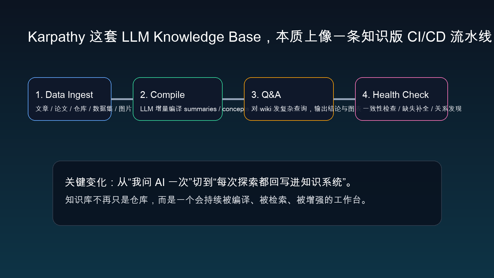 Karpathy 这套思路其实很清楚:先把原始资料统一摄取到 raw/,然后让 LLM 增量“编译”出一个结构化 wiki,再围绕这个 wiki 做问答、输出和体检。